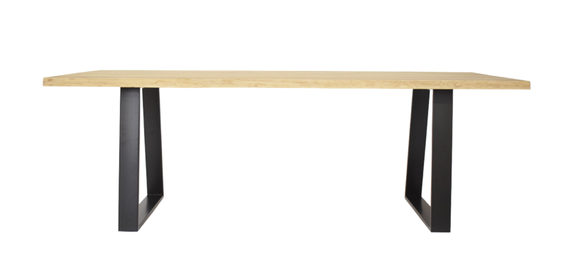 Трапезарна маса с масивен плот от рустикален европейски дъб, дебелина на плота 4 см. изработен от слепени цели ламели със свободни ширини.Предлага се с окрайчени (90 градуса или скосен под ъгъл 45 градуса ) и неокройчени страни по дължина. Финиш : прозрачно био масло 3032 ОсмоРазмери по избор (подходящ за маси от 160 см. до 220 см ), опция за разтягане. Крак от кух стоменен профил 6х2 см.