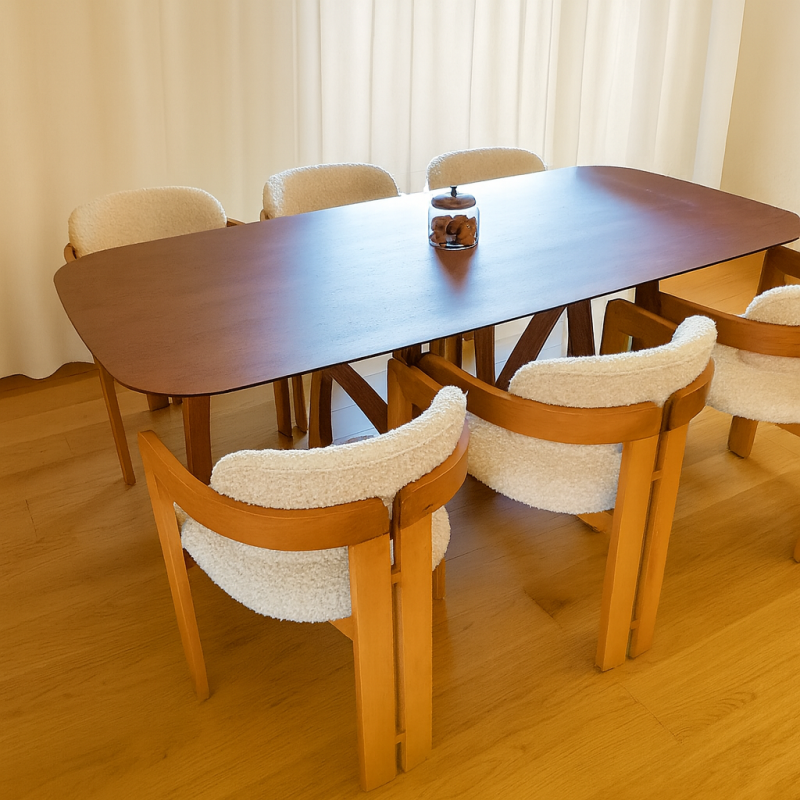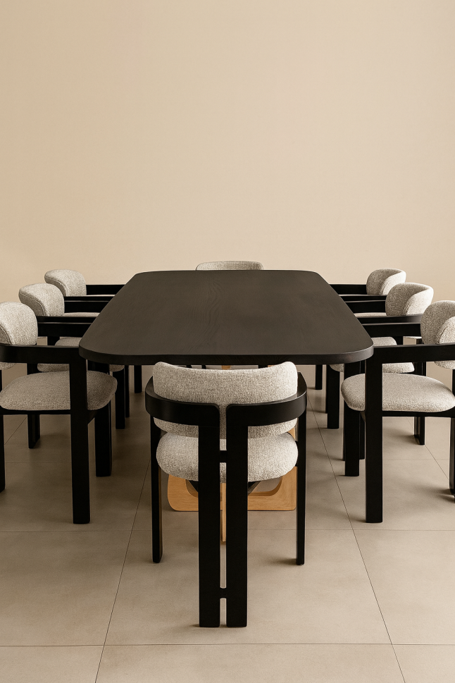 Трапезарна маса с плот от масивен дъб слепени цели ламели с дебелина 4 см или Фурнирован МДФ ДЪБ. Kрак изработен от масивен дъб, цветове по каталог. Финишът на плота (прав под 90 градуса, неокрайчен или скосен), изпълнява се в натурален цвят или с тониране с БИО масла. За различен размер от посочените се свържете с Нас