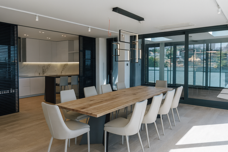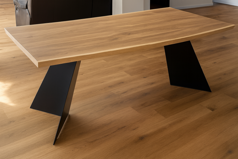 Трапезарна маса с плот от масивен дъб, състарен , слепени цели ламели с дебелина 4 см ., 1. oкрайчен , 2. неокрайчен (със свалена кора), 3. скосяване под 45 градуса . Kрак изработен от листове стомана (плътен) , цветове на по RAL . Финишът на плота се изпълнява в натурален цвят или с тониране с БИО масла.Размери по избор (подходящ за маси от 160 см. до 300 см. ), опция за разтягане.