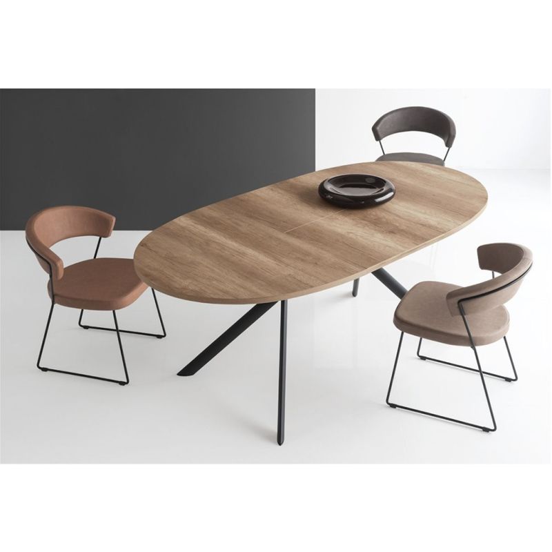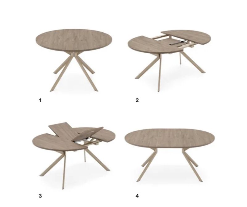 Разтегателна маса GIOVE, метална основа с кръгъл плот от дърво, дърво-керамика или дърво-стъкло. Централна неподвижна метална основа с четири наклонени крака с елипсовидно сечение и механизъм за отваряне, подобен на книга, с централно разширение, съответстващо на основата. Опростените и решителни линии го правят подходящ за всяко жилищно пространство.