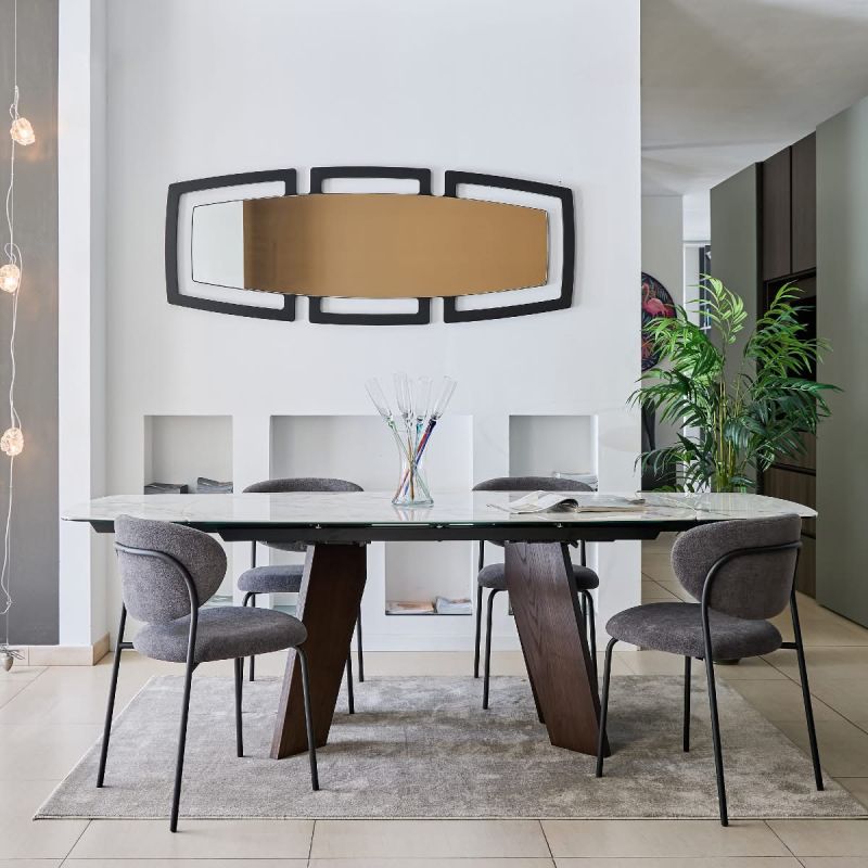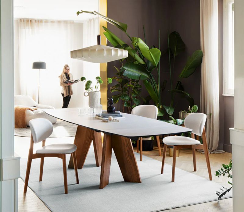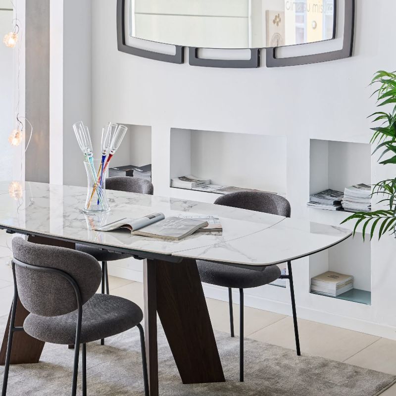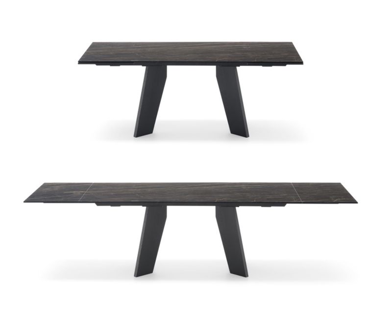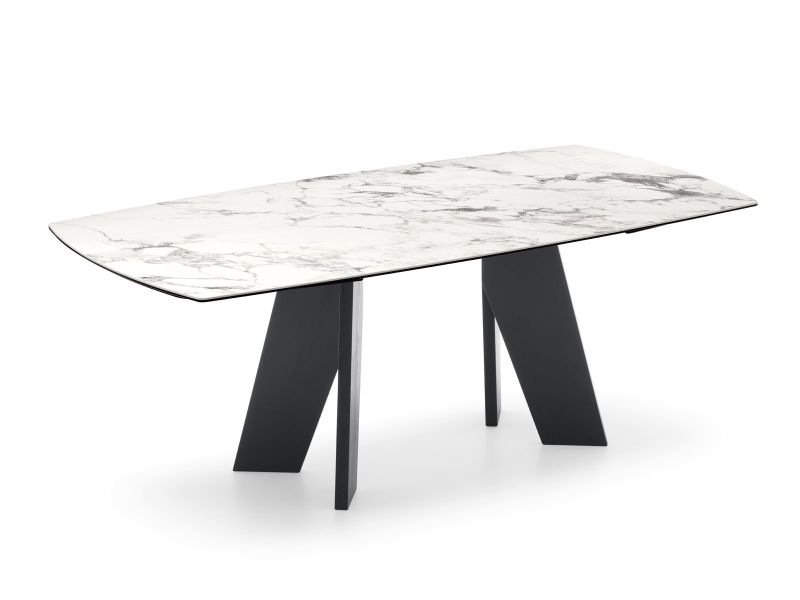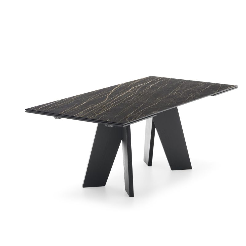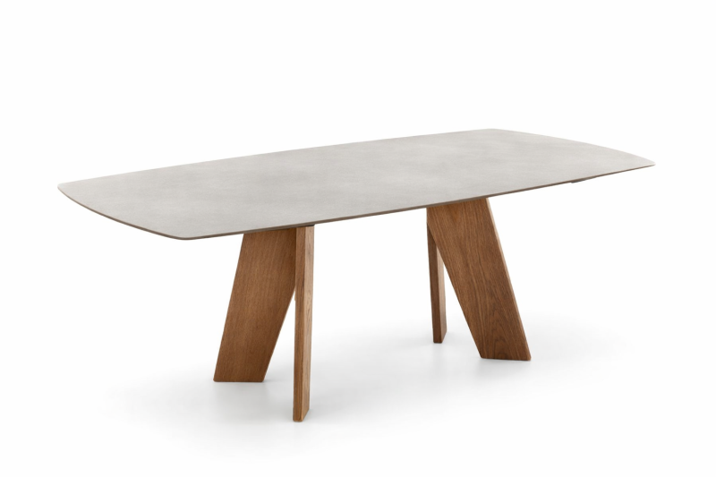 Масата Victor се отличава с основата си, характеризираща се с две оцветени опори от ясеново дърво, които създават отличителен графичен знак и придават динамика и визуална инерция на целия дизайн. Изисканият и издръжлив керамичен плот се интегрира хармонично с основата, засилвайки контраста между материалите. Балансът между здравина и лекота прави тази маса елемент с голямо естетическо въздействие, способен да обогати всяка среда със своята елегантност.
