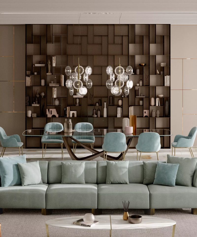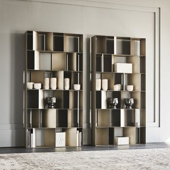Модул за библиотека с рамка от лакиран метал, с опционален плот от стъкло и опционална основа от тъмен месинг и матово черна метална рамка.