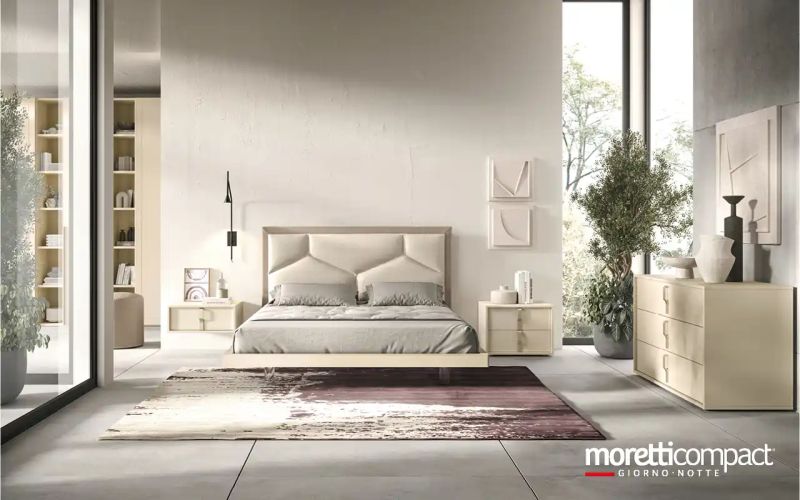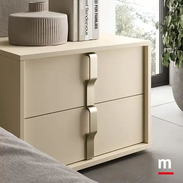 Спалня Gemma с легло Alcor. Тя се откроява със своята уникална индивидуалност. Колекцията Gemma позволява широка персонализация благодарение на форми, цветове и материали, подходящи за светли и елегантни пространства. Дизайнерските дръжки подчертават красотата на различните елементи.