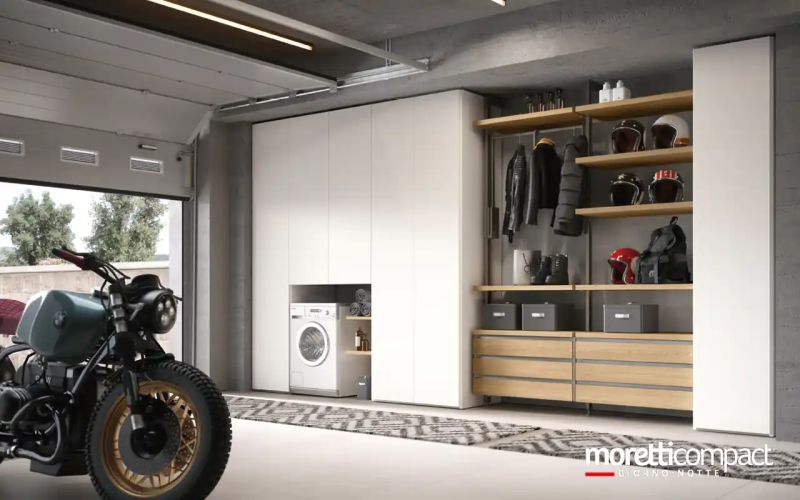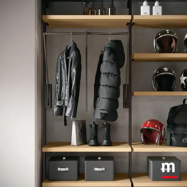 Стена, организирана с обикновен гардероб с панти и модул за пране, допълнен от практичен гардероб с рафтове и чекмеджета. Система, която се вписва във всяко пространство, подходяща за съхранение не само на дрехи, но и на предмети и оборудване.