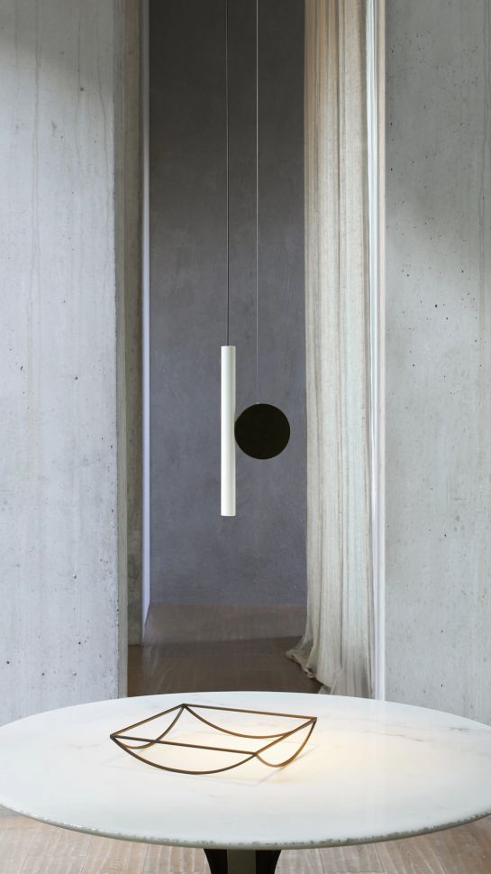 Лампата изглежда стабилна, но винаги е в състояние на напрежение. DOI се състои от две части: диск (прикрепен към тавана със стоманен кабел) и прожектор (от екструдиран алуминий, захранван от тънък електрически проводник).