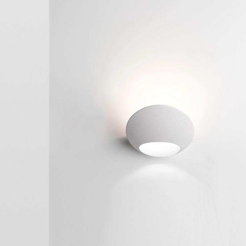Апликация, която сякаш се оформя от самата стена, в единен плътен обем от меки, правилни повърхности, които се срещат, за да създадат прецизни ръбове, превръщащи се в поразителни графични знаци. Когато лампата е включена, светлината на светодиода се отразява от стената, създавайки ярък контраст, а след това се плъзга вътре в отвора, осветявайки го и деликатно оформяйки арка на стената.