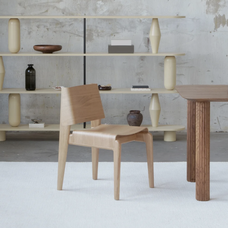 Столът UNDIA съчетава масивна дъбова рамка с меко оформени, огънати елементи от шперплат, които формират седалката и облегалката. От тези два материала се очертава единна, плавна форма с лек и деликатен характер.