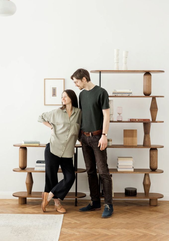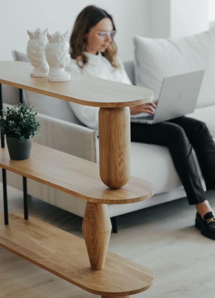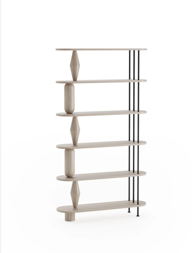 VAZOO е модулна система от рафтове, изградена около отличителни, струговани форми, напомнящи вази. Тези скулптурни елементи поддържат рафтовете, като същевременно добавят смел визуален акцент към цялостния дизайн. За да се създаде контраст и усещане за лекота, се използват прахово боядисани стоманени пръти като фини, ажурни детайли, които компенсират масивността на дървените компоненти. Модулният характер на VAZOO позволява гъвкава конфигурация - броят на рафтовете може да се регулира според индивидуалните нужди, което я прави универсално решение както за жилищен, така и за търговски интериор.