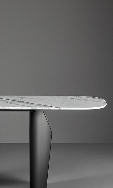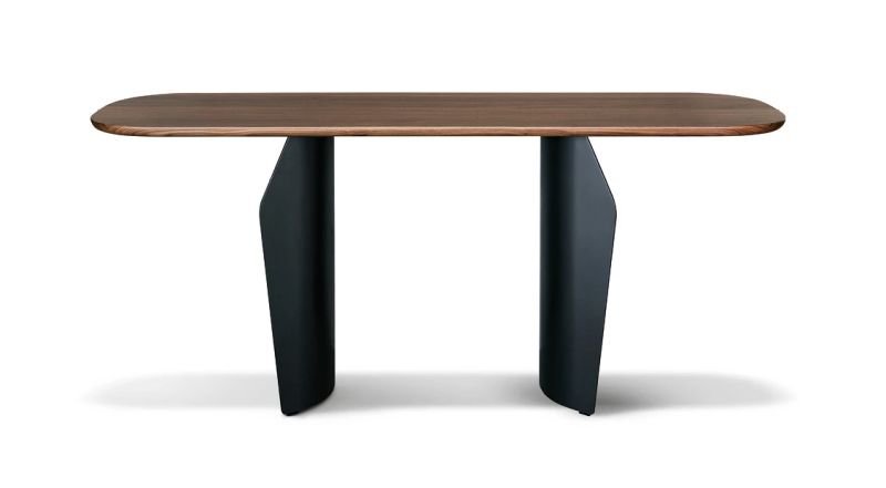 Има широка гама от възможности за персонализиране, тъй като плотът се предлага в дърво, керамика или мрамор и с покрития, които контрастират с визуалната и структурна здравина на двойката метални крака.
