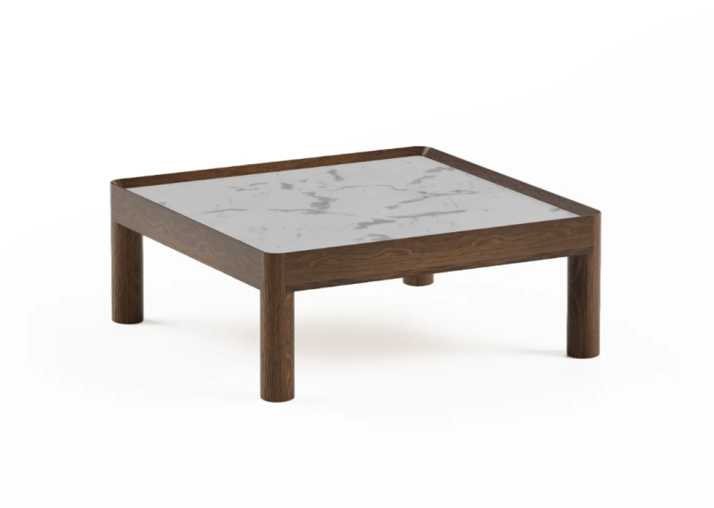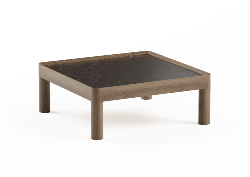 INSET се определя от масивна дъбова рамка, която придава на изделието структура и присъствие. В нея плотът е поставен като вложка, прецизно паснала и умишлено контрастираща с топлината на дървото. В зависимост от материала, характерът на масата се променя от мек и естествен с фурнирована повърхност до по-тактилен и дефиниран, когато е завършена с камък. Композицията остава ясна и балансирана, изградена върху пропорции, материал и сдържаност.