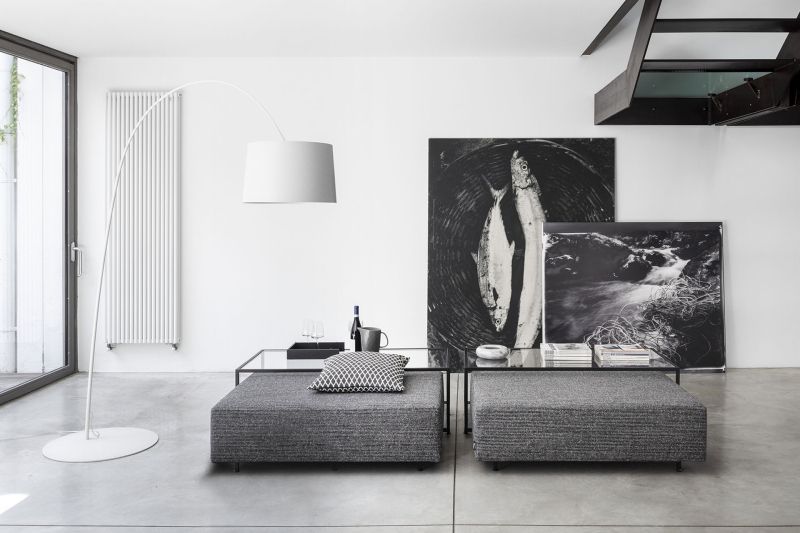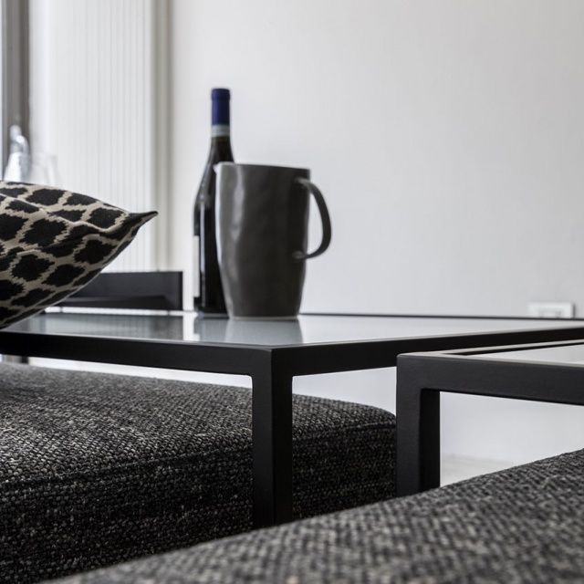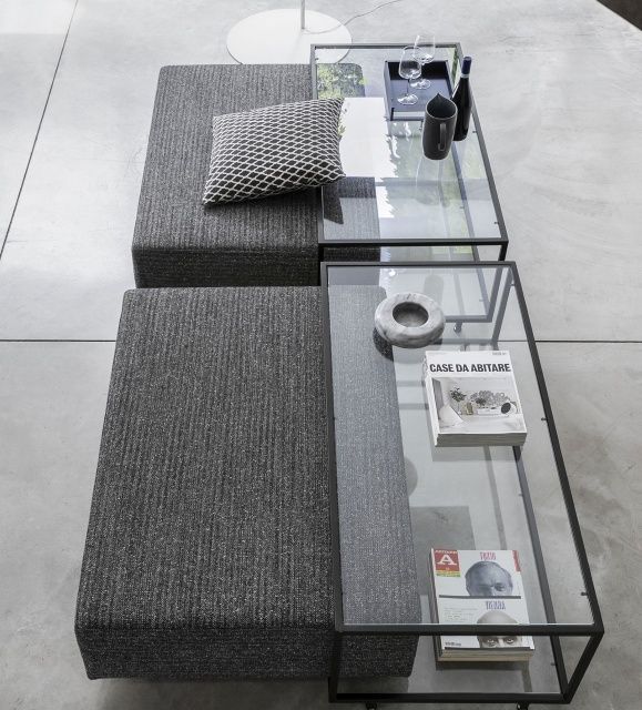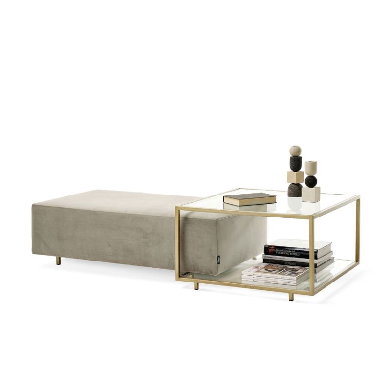 Пуфът Zoom е с подплатен калъф и свалящ се капак, с масичка за кафе с метална конструкция, предлагана в патиниран бронз или черно боядисано покритие, с прозрачен стъклен плот. Вечна класика, идеална за хола като място за сядане и едновременно с това като масичка за кафе.