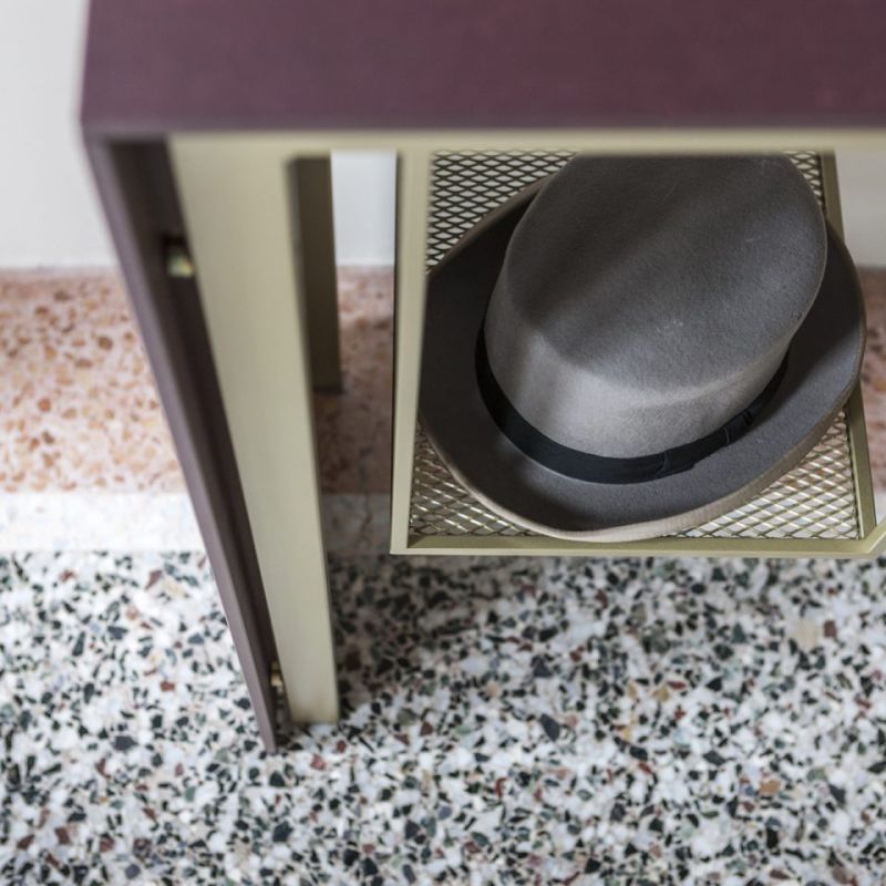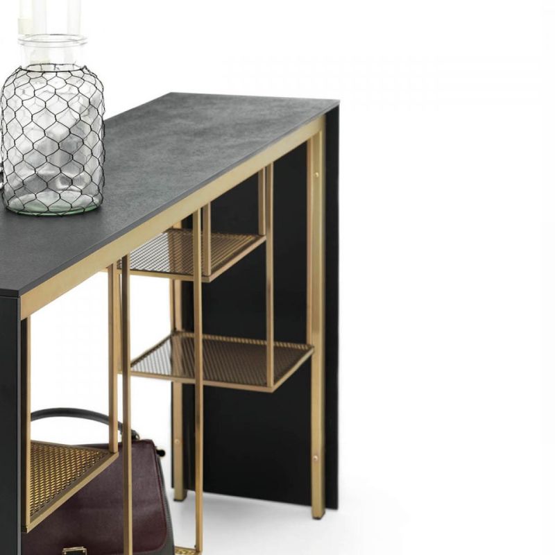Токио е конзола, а също и пейка. Метална конструкция и рафтове от разширен метал, боядисани в матово златисто, плот и страни в черно Valcromat. Практичен елемент, оборудван с използваеми опорни повърхности, окачени под плота, минималистичен и строг.