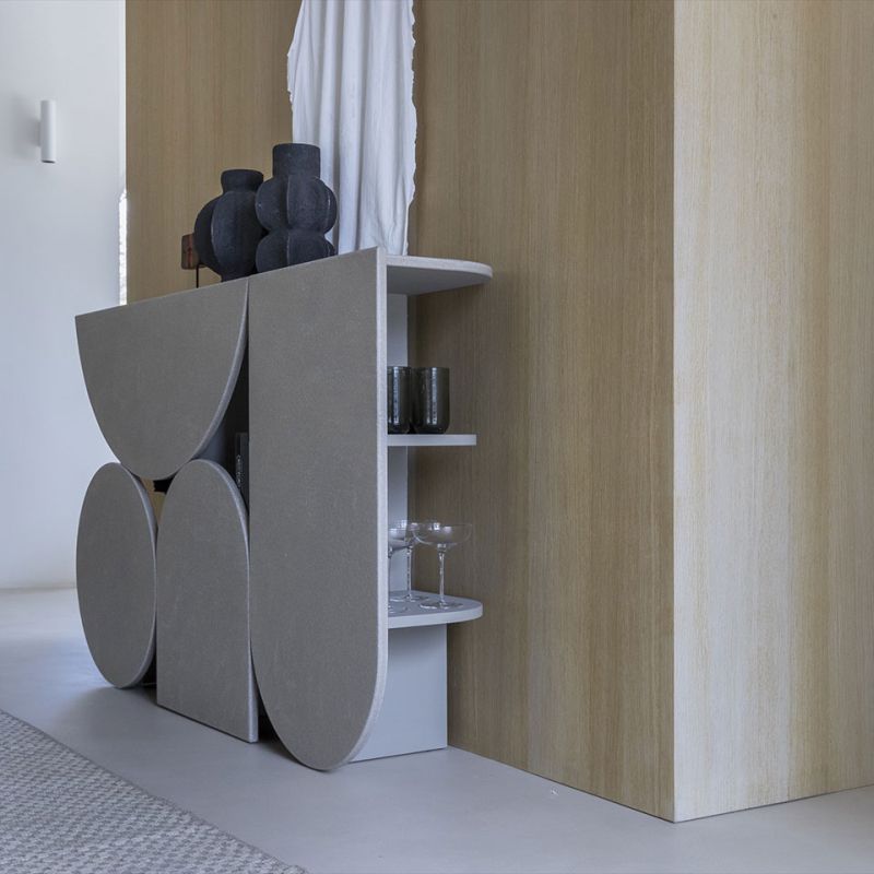 Конзола от MDF с матово или гланцово лакирано покритие и ръчно шпаклован материал в цветовете по мостра. Естетически баланс между крака и плот, за да обзаведе със силна индивидуалност различни зони на дома, от входа до пространството за преминаване от хола до зоната за спане.