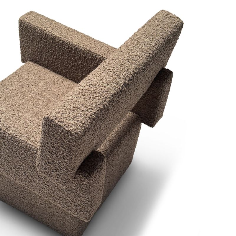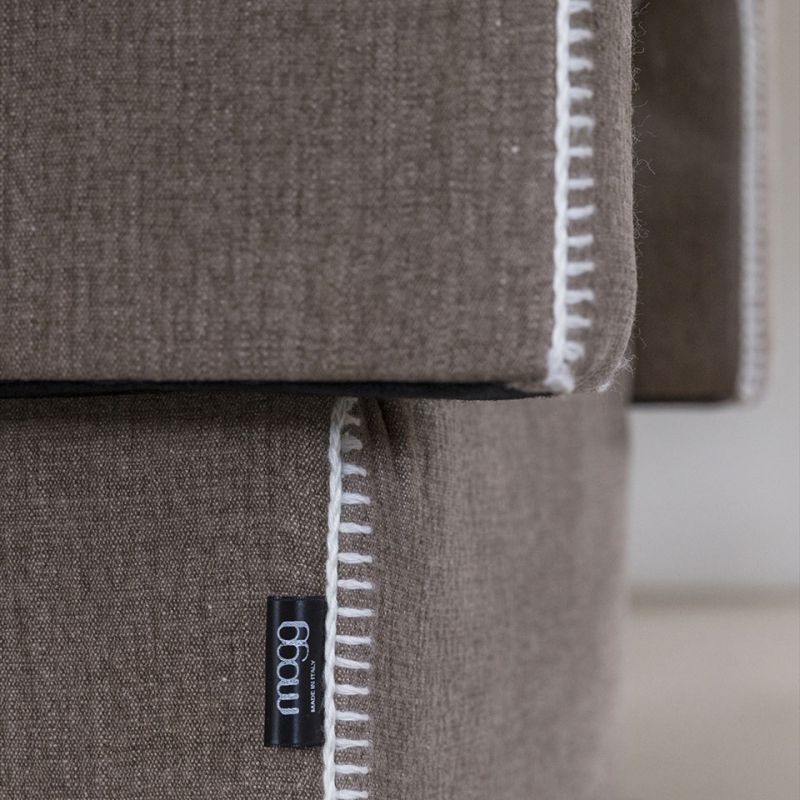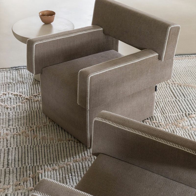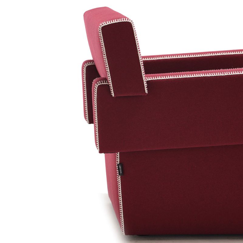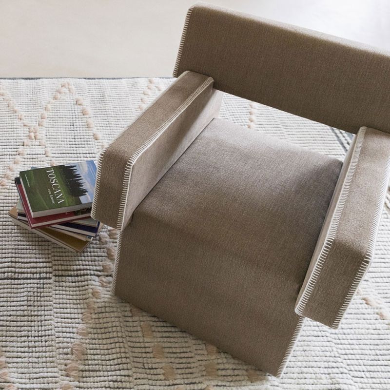 Тапициран фотьойл с несвалящ се калъф, многофункционален и вечен, съставен от семпли и основни обеми със строги пропорции. По заявка с шевове „пунто кавало“.