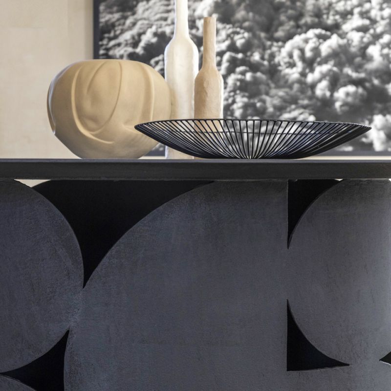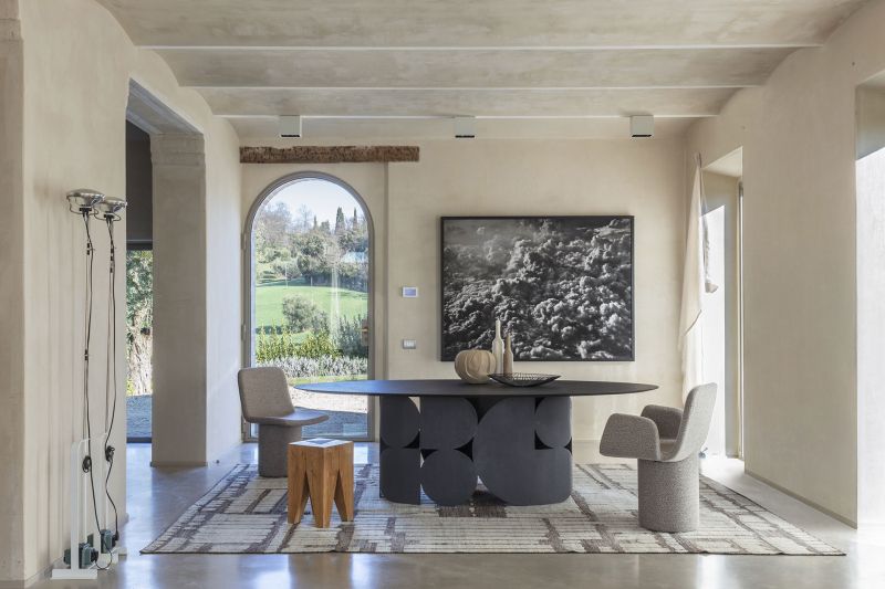 Маса с перфорирана метална основа и дървен плот. Предлага се в следните варианти: матов или гланцов лак във всички цветове по мостри или текстуриран, ръчно нанесен в цветове по мостри. Естетическият баланс между плота и централния крак придава на хола силен индивидуален вид.