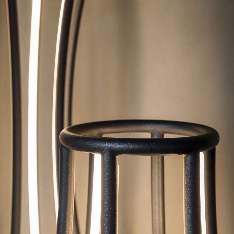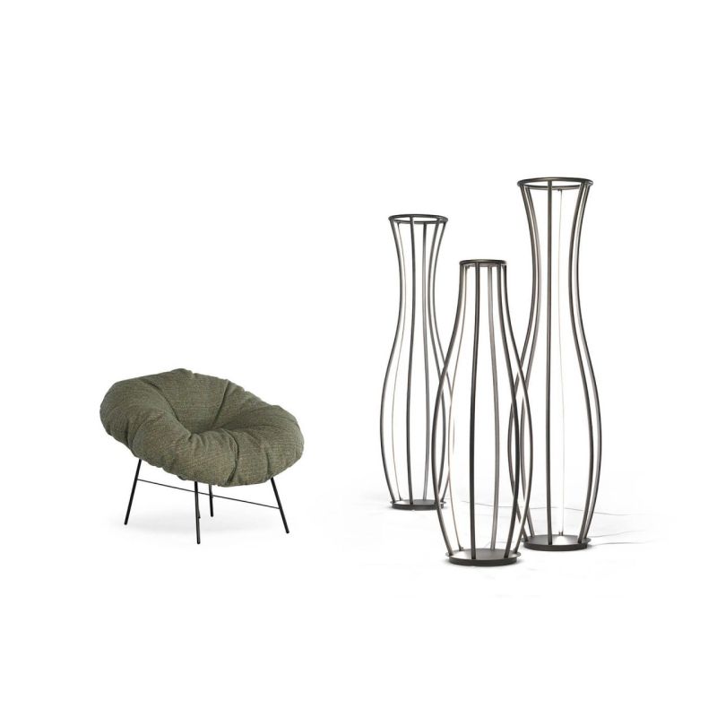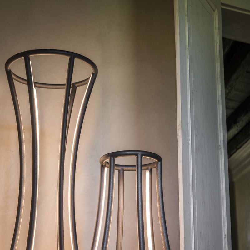 Penelope е подова лампа от извит метал, боядисана в слюдесто черно, с димируема LED светлина. Предлага се в две височини. Penelope е родена от синтеза на знак, извиващ се и хармоничен като перфектния профил на жена. Профил, който помещава източник на светлина вътре, умело съчетавайки форма и функция.