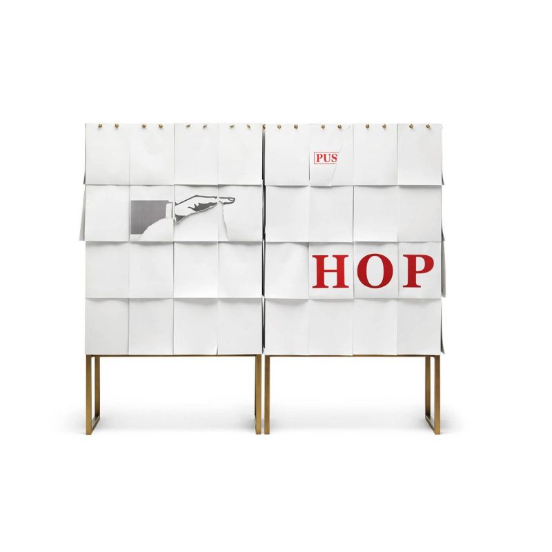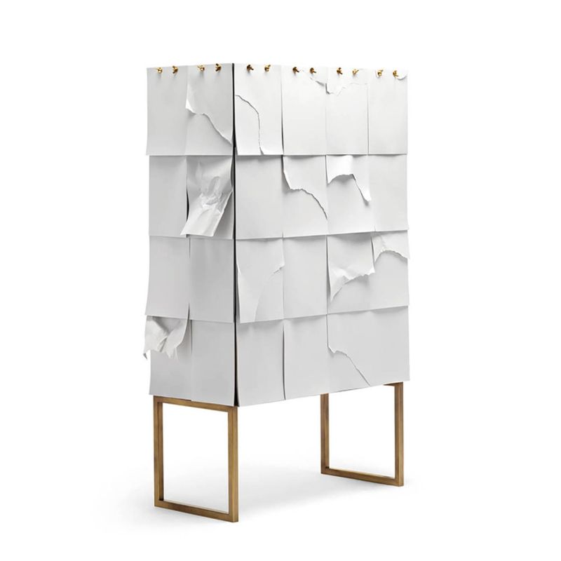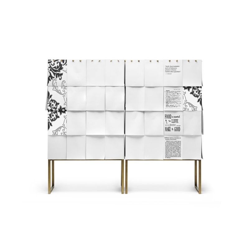 Notes е шкаф за съхранение с конструкция от сив Valcromat MDF, с предна и странична облицовка, покрити с листове хартия A4, които се припокриват и могат да се сменят. Основата е от метал с патинирано бронзово покритие. За да напишете каквото искате: списък за пазаруване, съобщение, рецепта, Notes винаги може да се променя и винаги да бъде уникален, персонализиран от потребителя.
