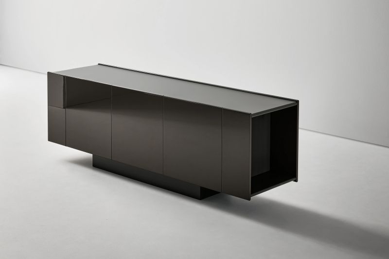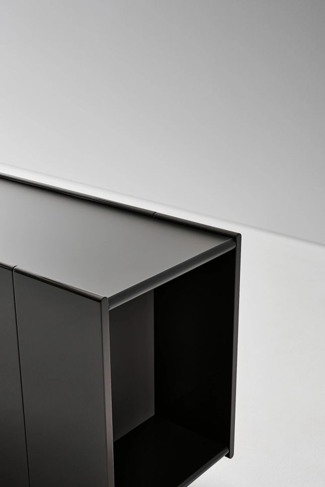 Бюфетът Spy съчетава значителен обем с детайли, които олекотяват присъствието му: тънкият ръб, очертаващ периметъра на горната част, компактната основа и отворените странични отделения допринасят за създаването на усещане за лекота, балансирайки плътните и празни пространства. Отварянето на двата странични панела осигурява допълнителна опорна повърхност, повишавайки практичността му и го прави подходящ и като елемент за разделяне на пространството. По този начин Spy надхвърля традиционната функция на бюфет, превръщайки се в мебел, способна да организира пространството, като същевременно показва предмети, оставени на показ. Spy се предлага в мономатериална версия, изцяло от лакирано дърво, или в многоматериална версия с горни и странични панели от керамика, където линейността на структурата е съчетана с изразителното богатство на повърхностите.