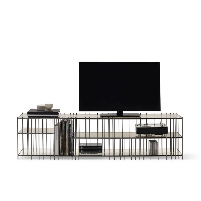 Метален телевизионен шкаф Metrica с опростена конструкция, чийто ритъм се определя от железни пръти, закрепени на различни интервали, където обектите допълват формата си, създавайки нови композиции от време на време.