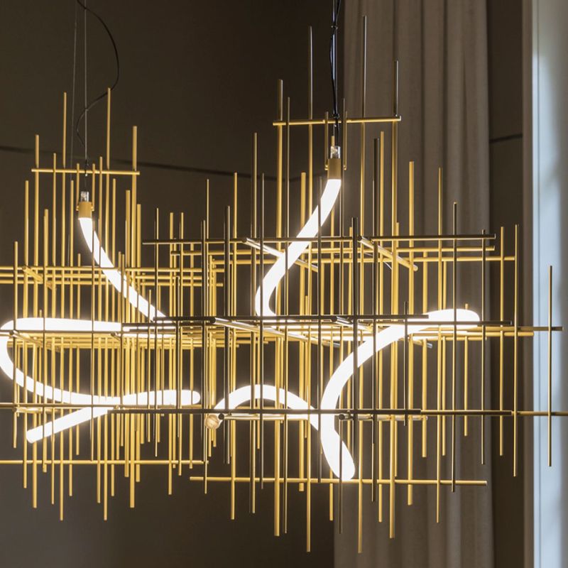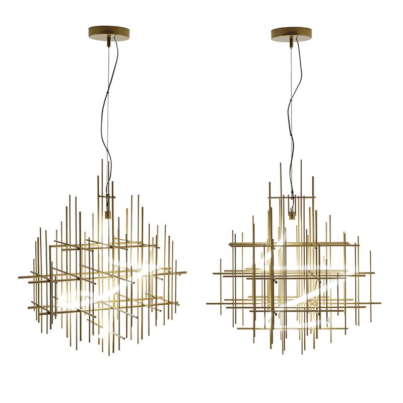Висяща лампа с метална конструкция, предлагана в полирани и златни покрития, с 360° LED тръба. Структурата е семпла и строга, ритъмът е обозначен от железни пръти, закрепени на различни интервали, светлинната тръба няма ограничения и ви кани да се изгубите в ритъма на сенки и отражения, винаги различни.