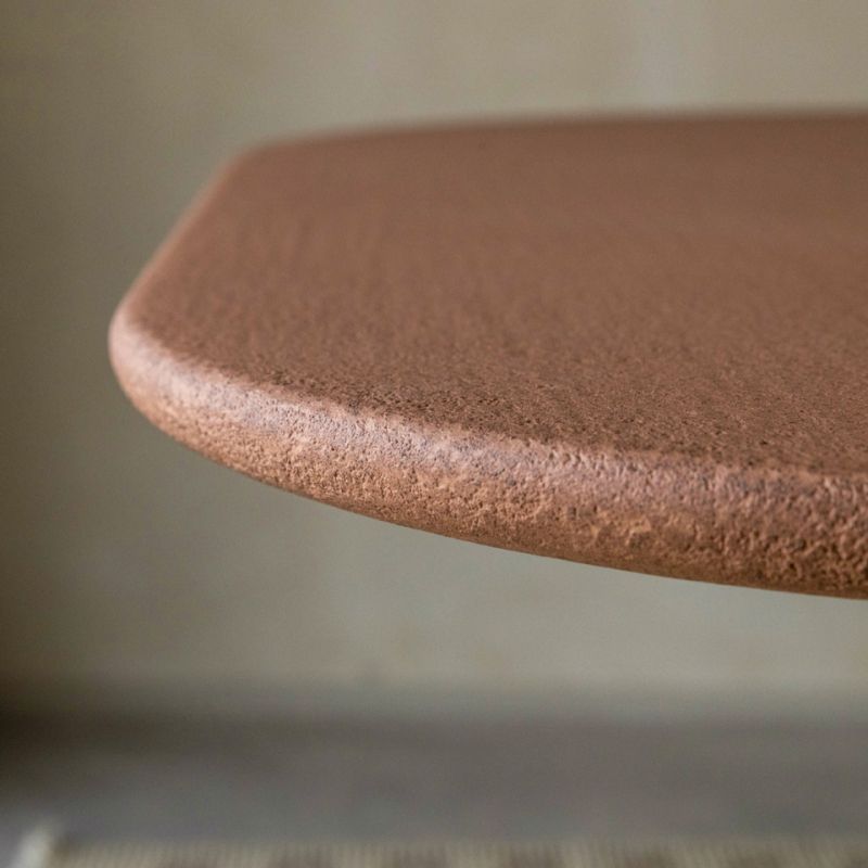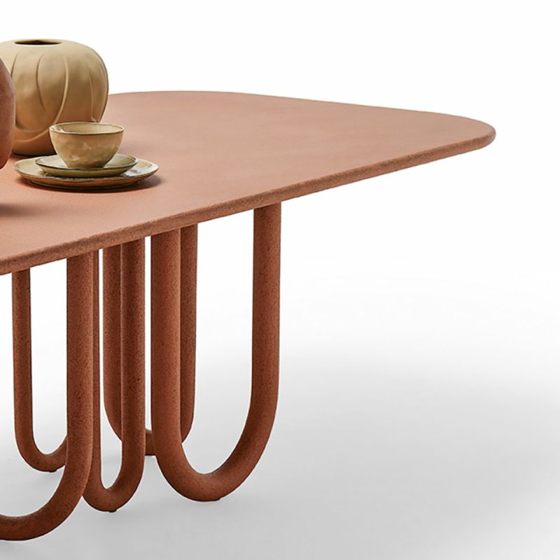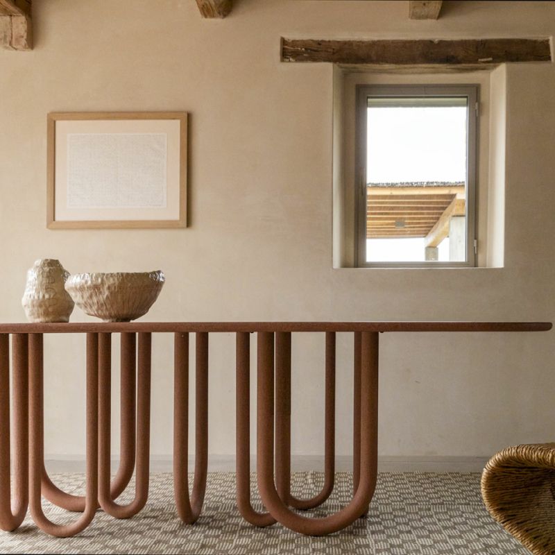 Маса с метална основа и дървен плот. Предлага се в следните варианти: прахово боядисана в черно, матова или гланцирана, лакирана във всички цветове по мостри или текстурирана, ръчно нанесена в цветове по мостри. Обърнатите арки като крака я правят вечна мебел, която се вписва безпроблемно във всяко пространство, независимо дали е традиционно или модерно.