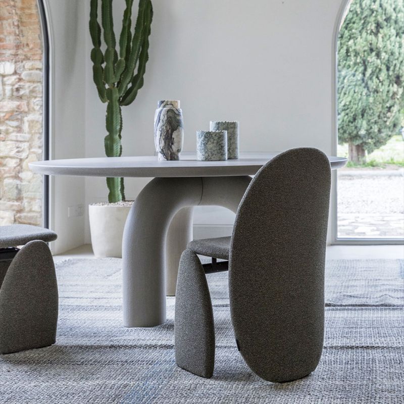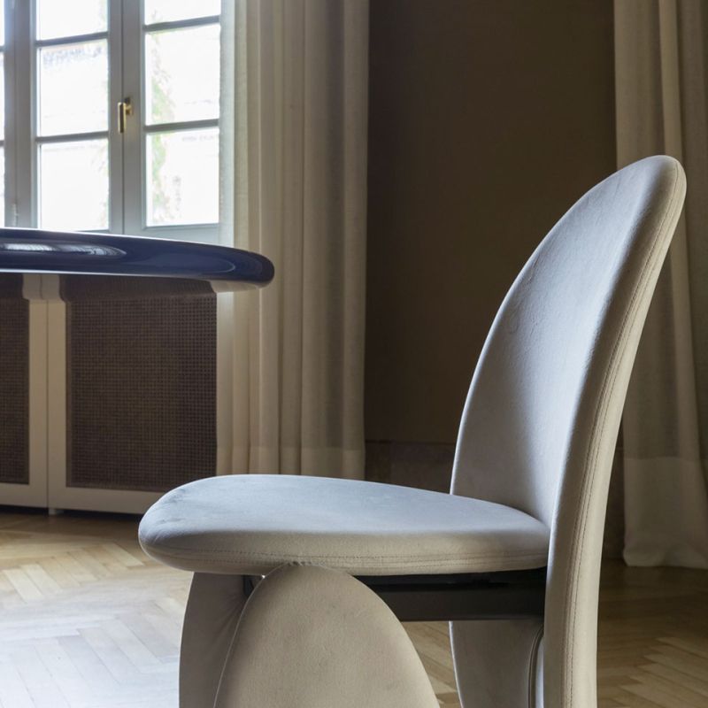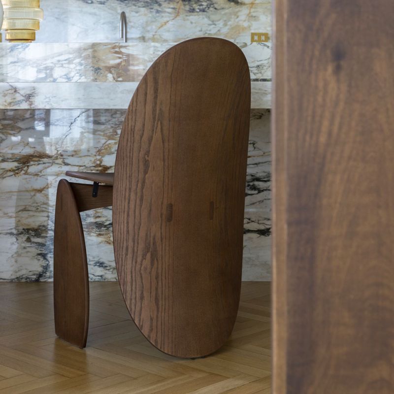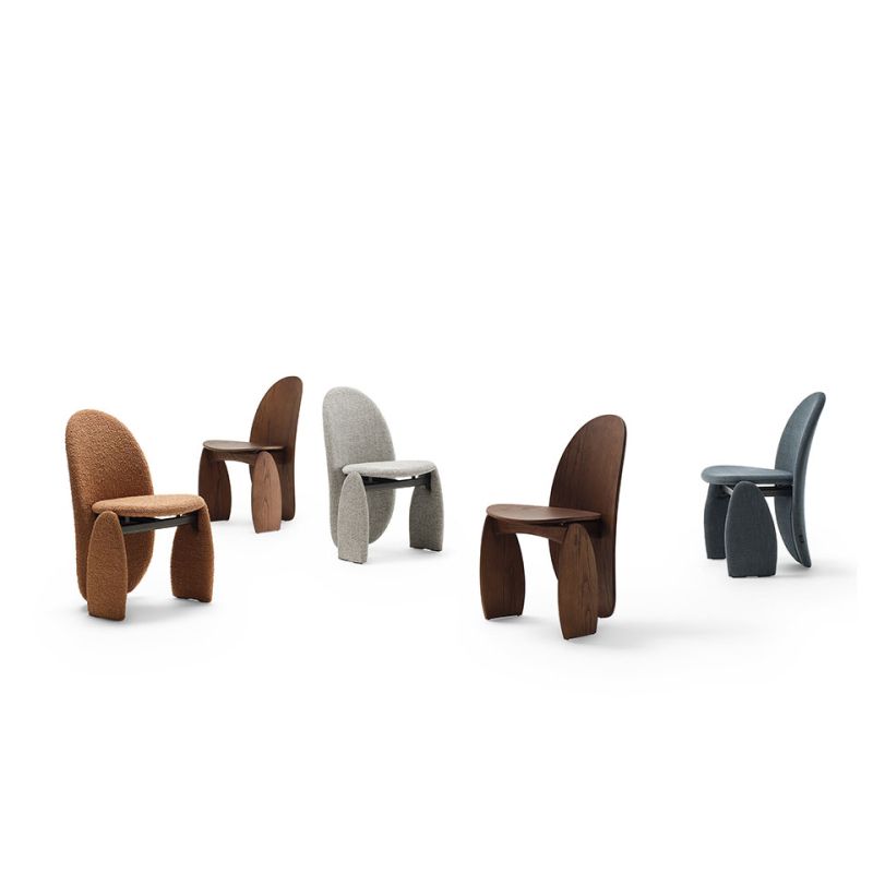 Стол от извит шперплат, предлаган в байцовано дърво или тапициран. Чиста свобода на изразяване със скулптурен вид, който извиква естествени форми. Меките жестови линии стават структурни и удобни под баланса на формално изследване, което изразява цялата честност на майсторството, видима в структурата и в присадките, като същевременно запазва очарованието на вечната елегантност.