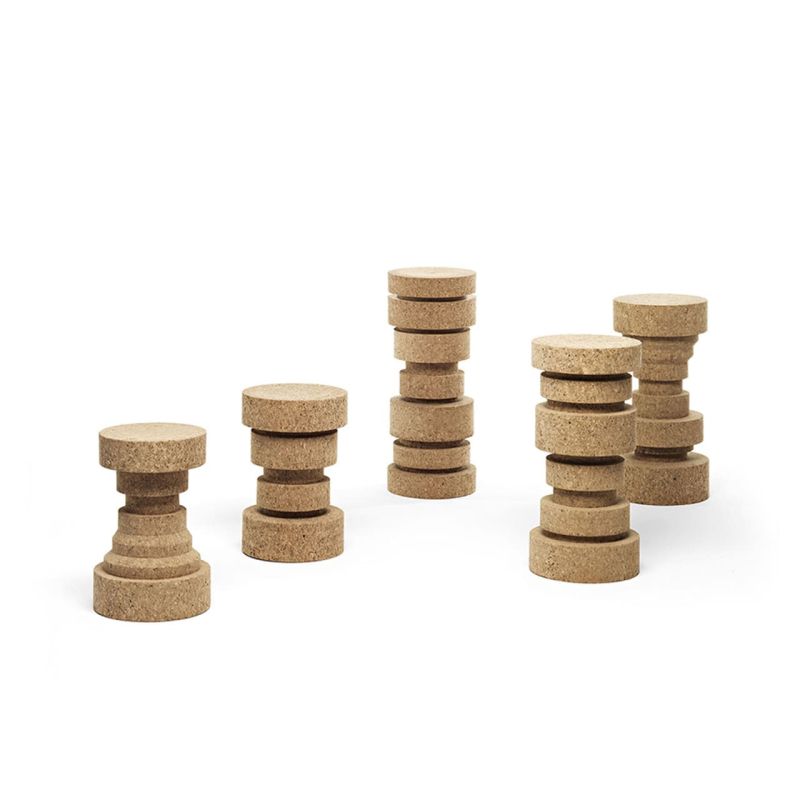 King&Queen са табуретки/масички за кафе от стругован корк. Вдъхновени от пешките на шахматната дъска, особено от пешките на царя и царицата.