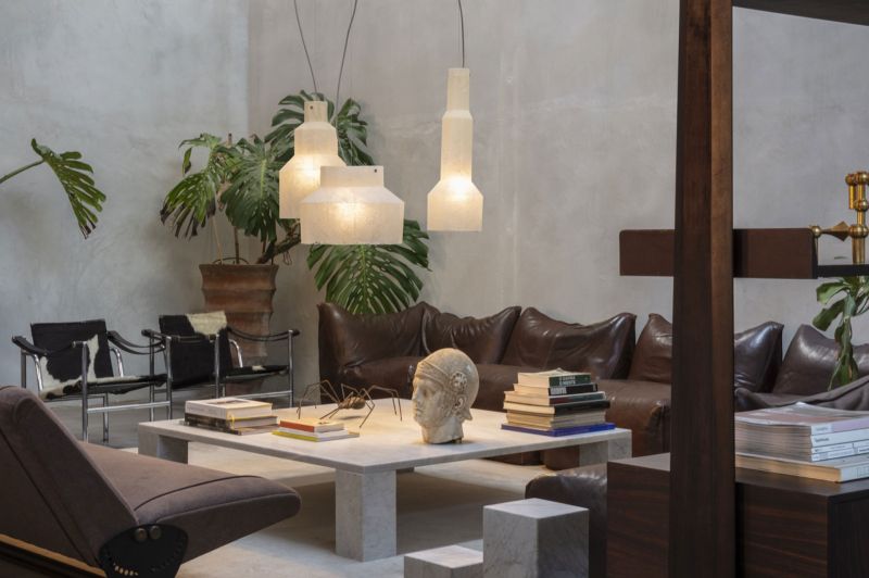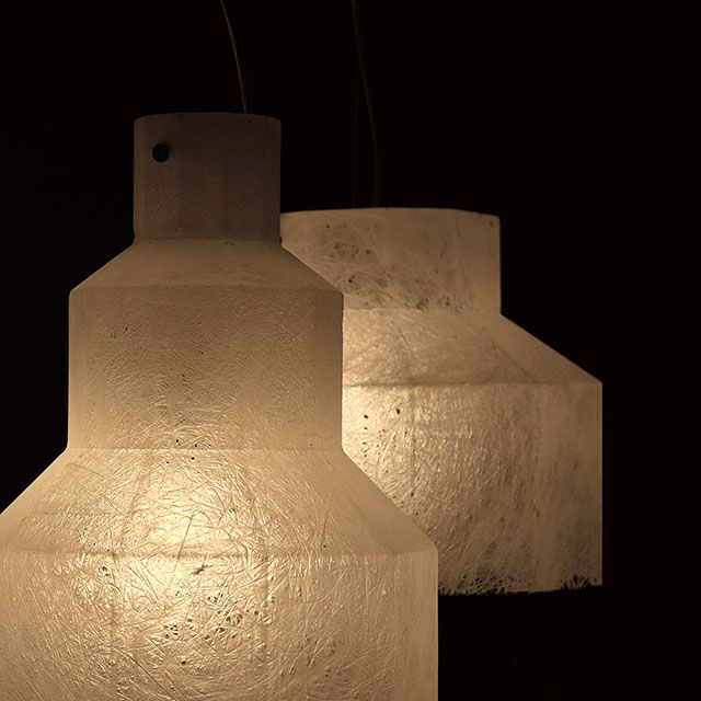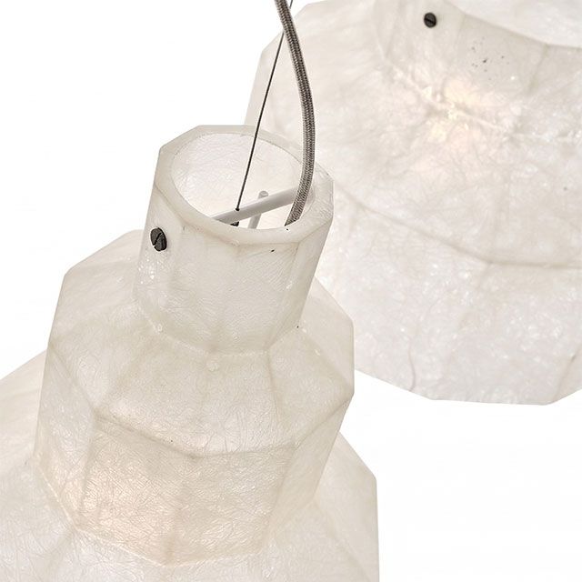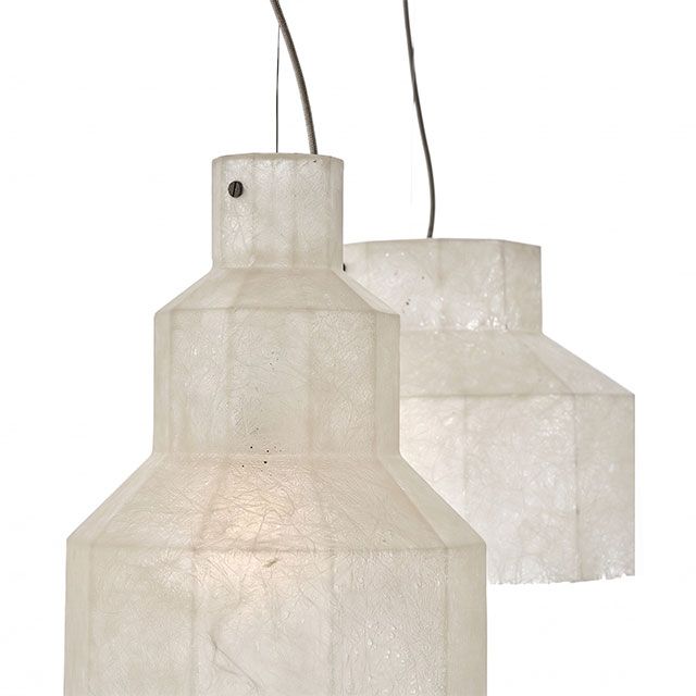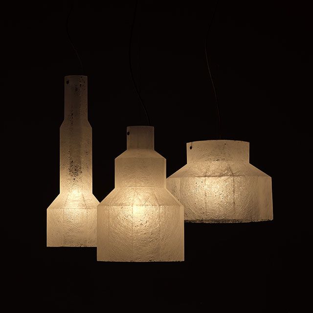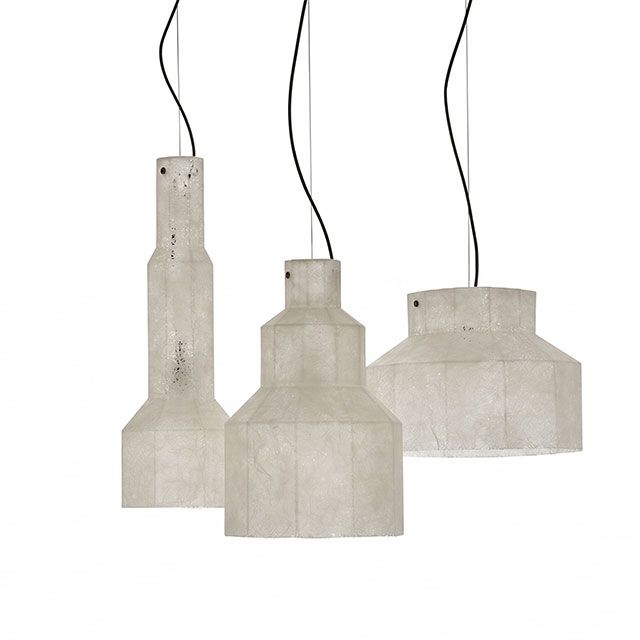 Семейство висящи лампи от стъкло-смола, замислени като три микроархитектури с призматични форми, предназначени да задържат и обгръщат светлина. Опалесцентните обвивки извикат полиедрични какавиди - леки, висящи присъствия, почти ефирни монолити, способни да подобрят атмосферата.
