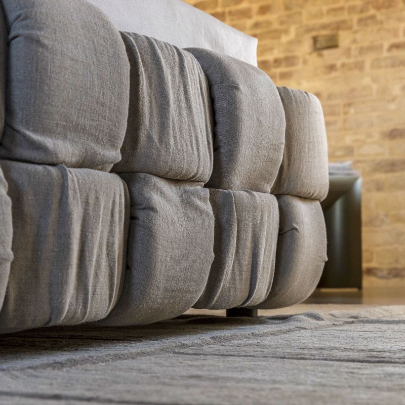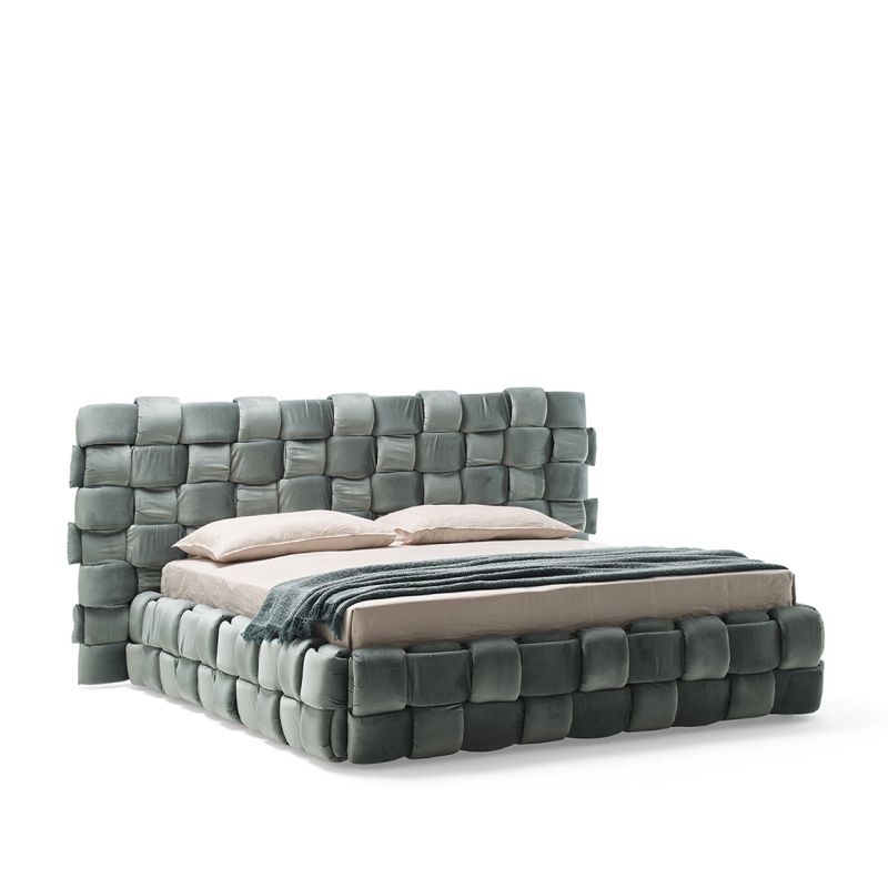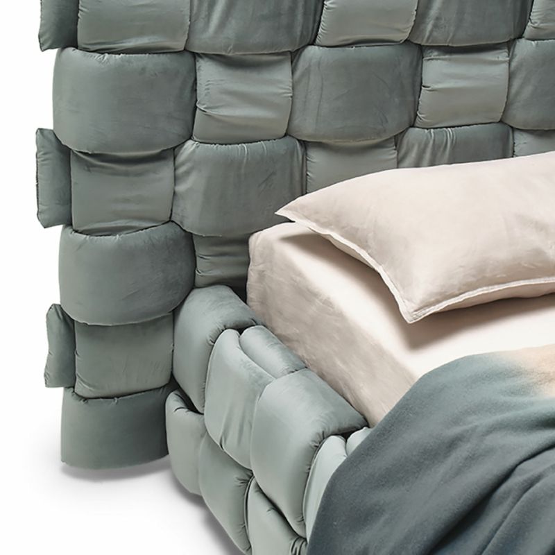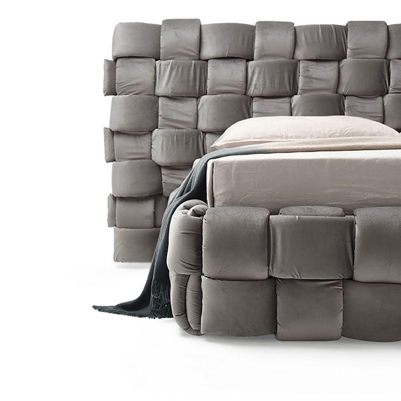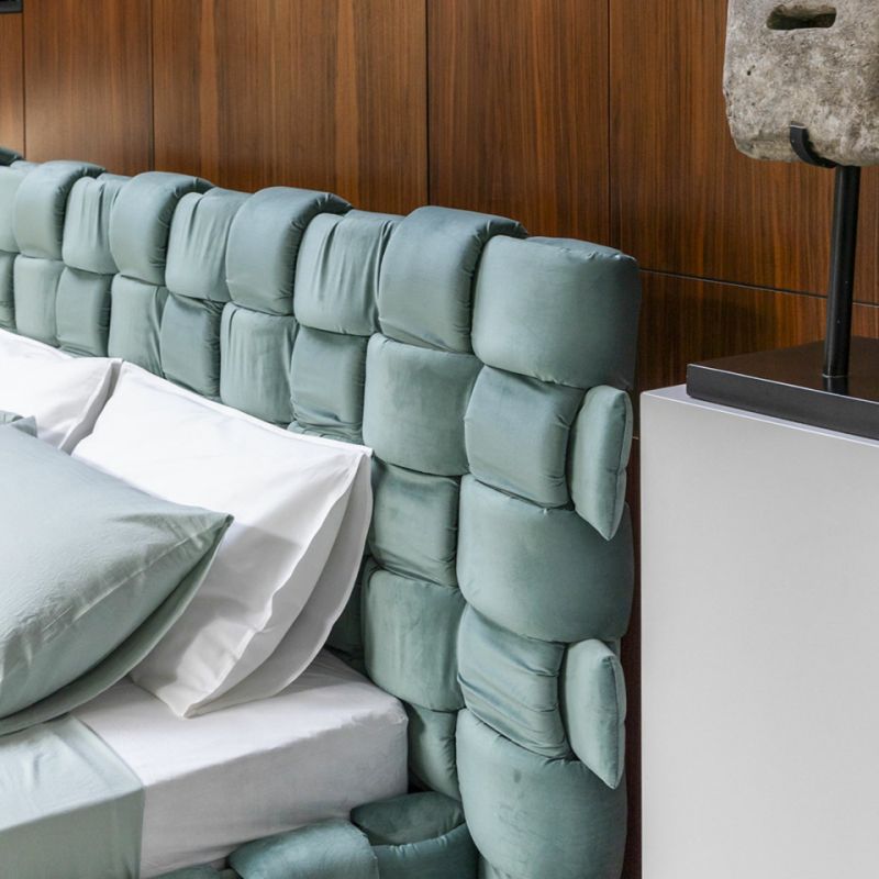 Двойно легло, което предава приятно усещане за комфорт благодарение на елегантното подплатено макро тъкане на голямата табла и рамката на леглото.