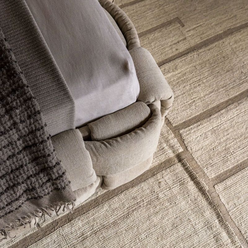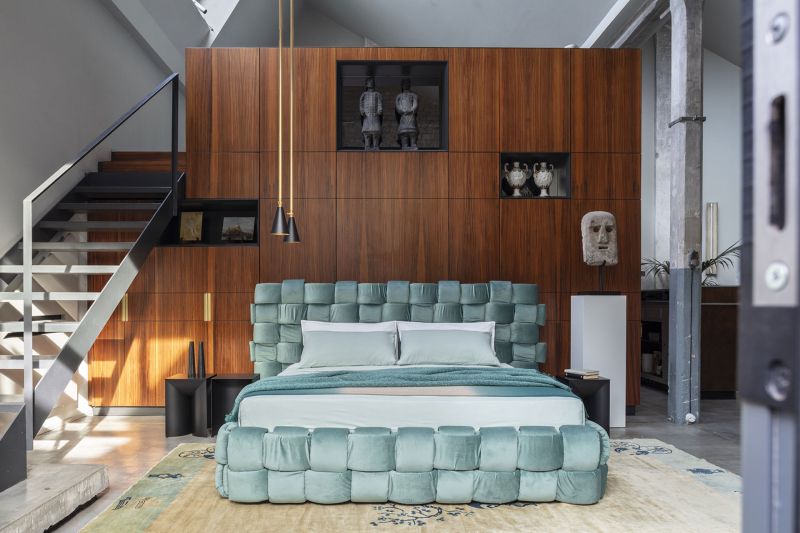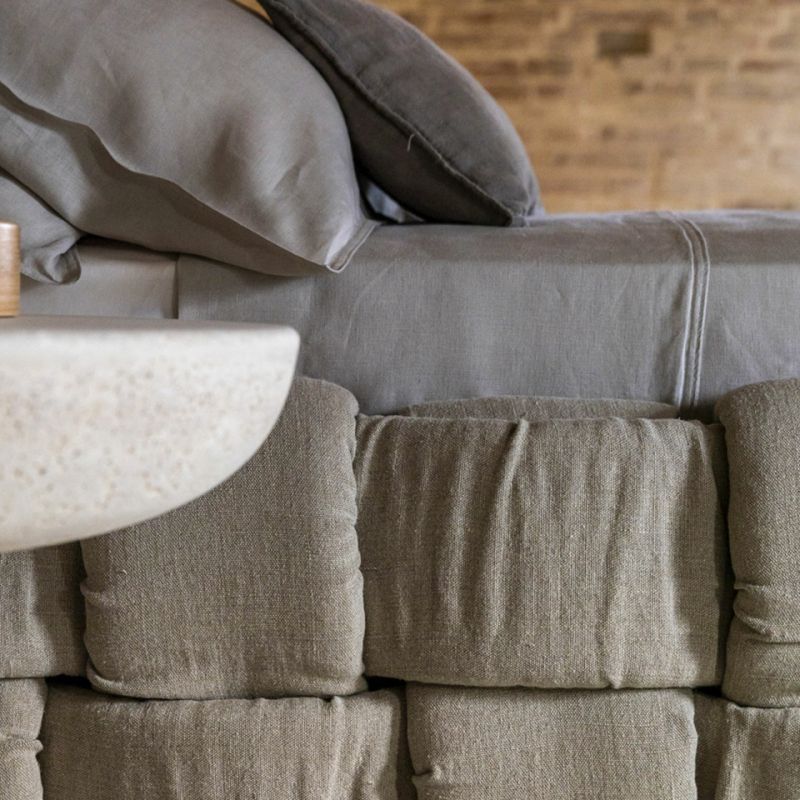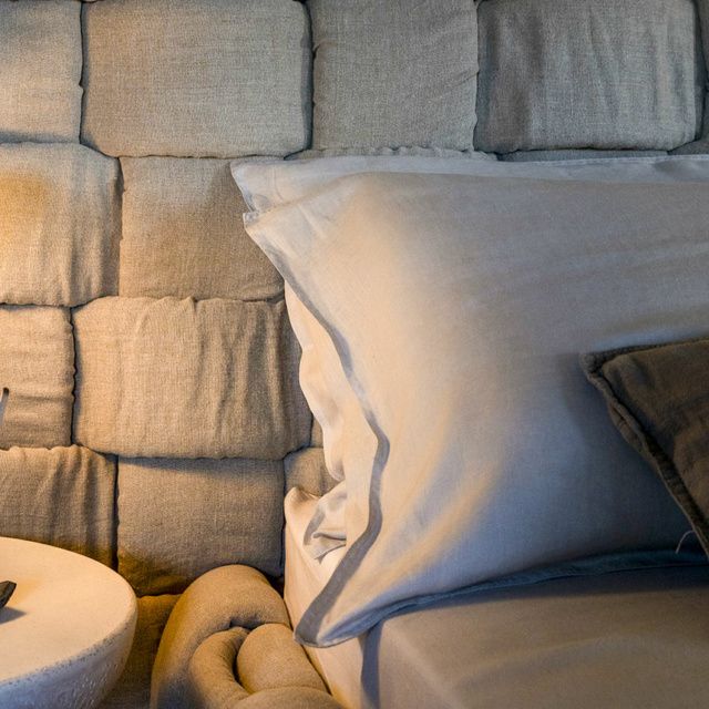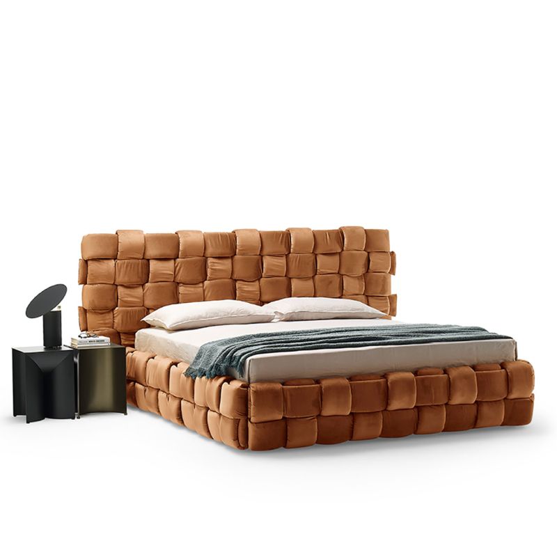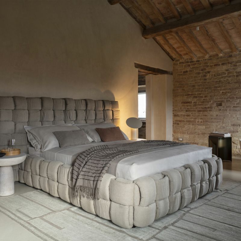 Двойно легло, което предава приятно усещане за комфорт благодарение на елегантното подплатено макро тъкане на голямата табла и рамката на леглото.
