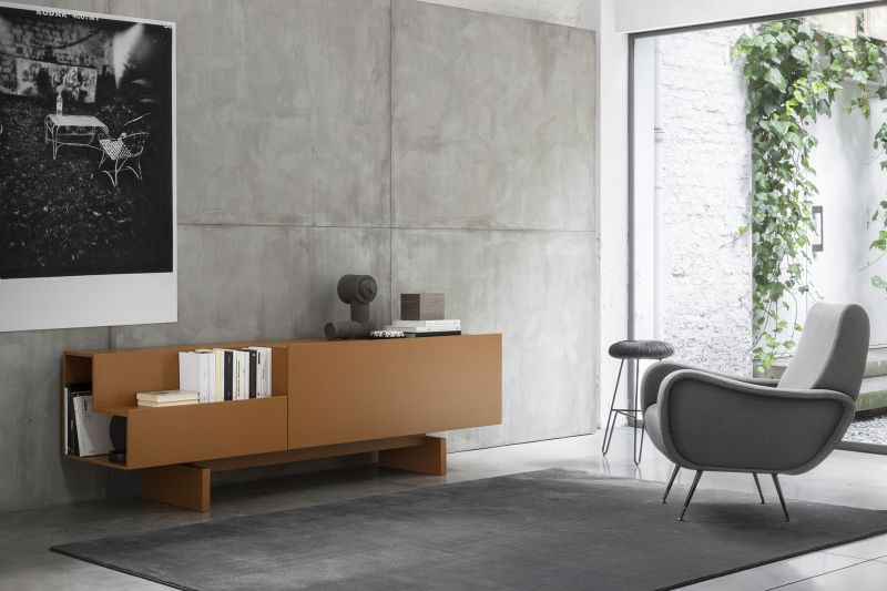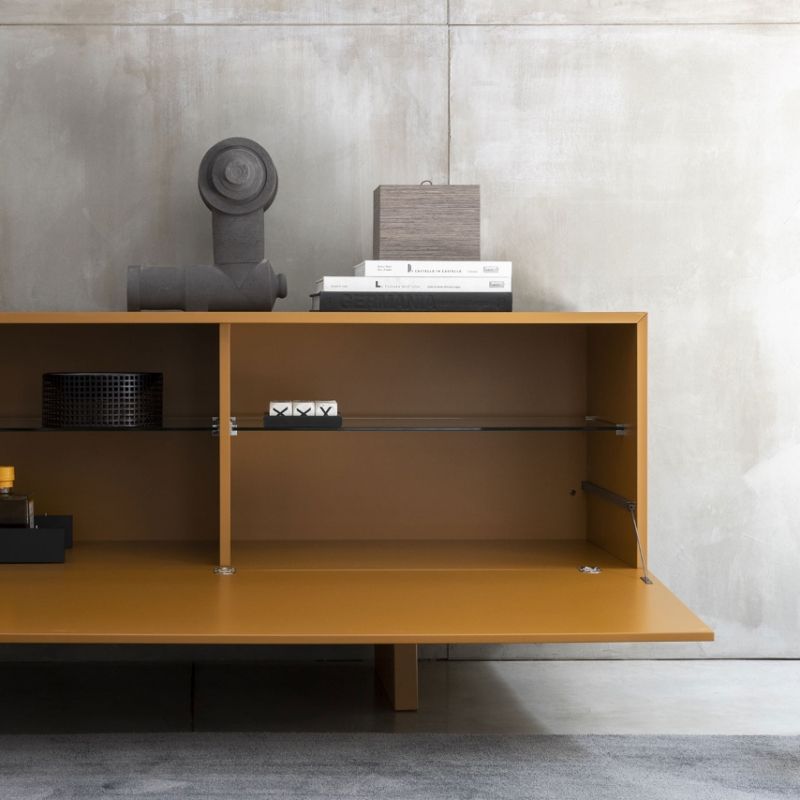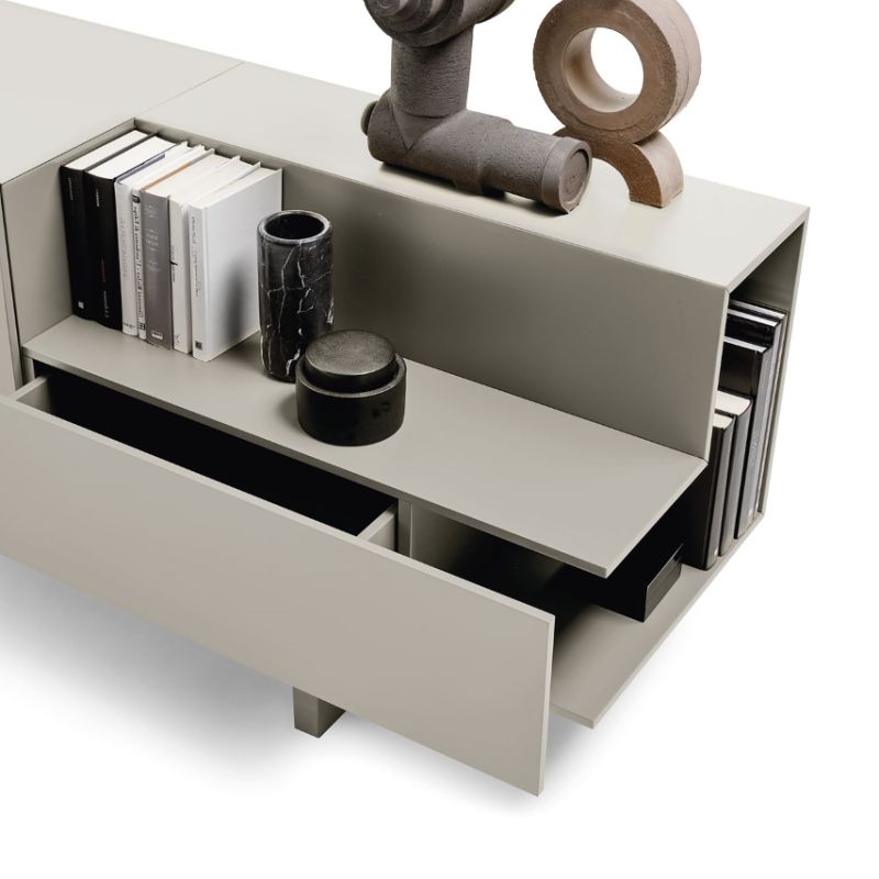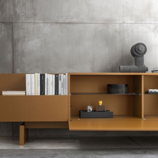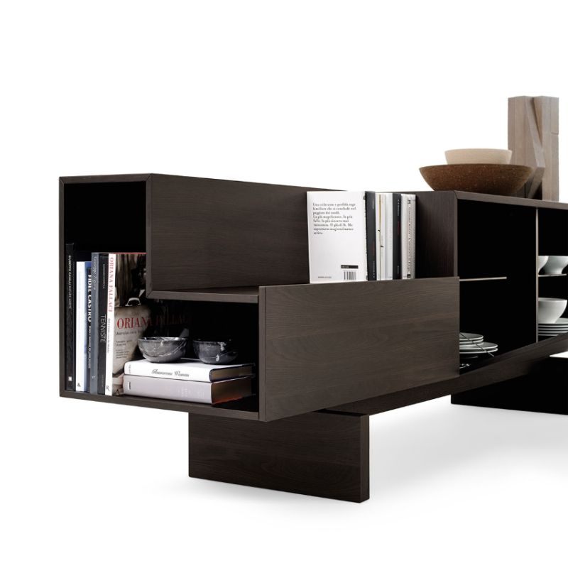 Ела е бюфет с конструкция от МДФ, лакиран във всички цветове според картата с мостри или покрит с термично обработен черен дъб. Контейнер с линеен дизайн благодарение на семпли и изчистени елементи, поставени един до друг и насложени един върху друг, на празни и пълни пространства, които придобиват архитектурен характер във всяка стая на къщата.