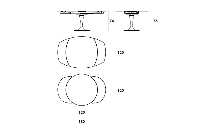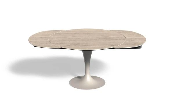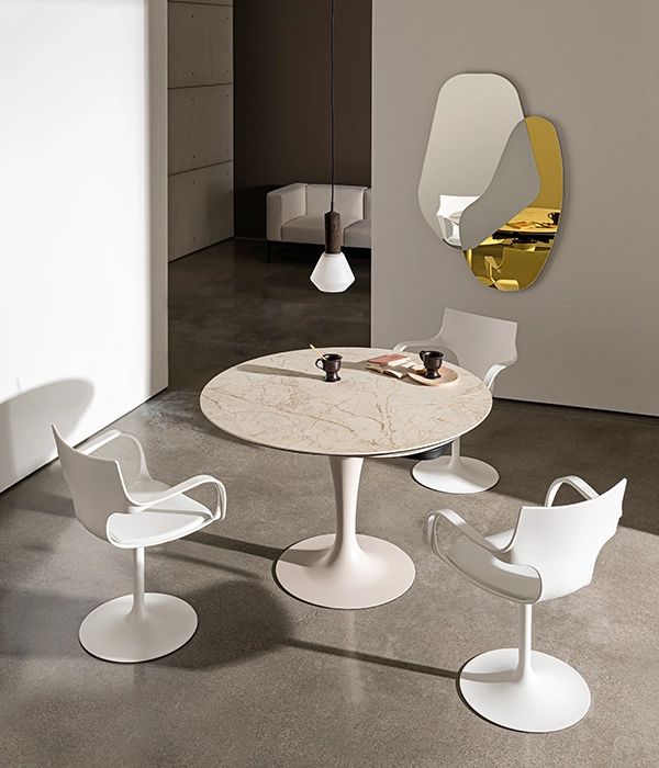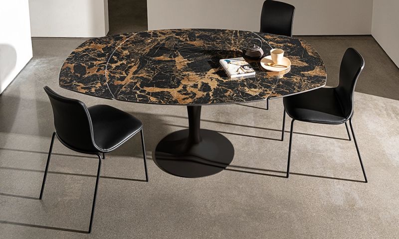 Трапезна маса с хромирана или лакирана метална основа, различни покрития. Предлага се плот от закалено стъкло, MATERIA или керамика, различни покрития.