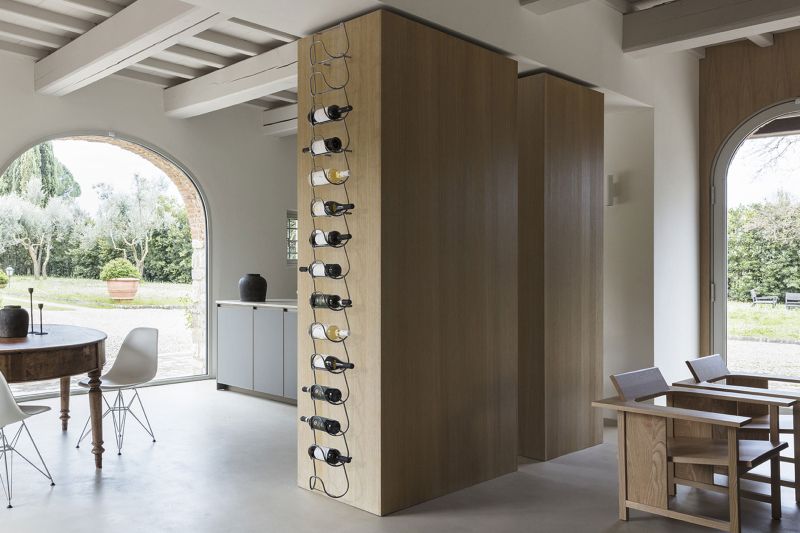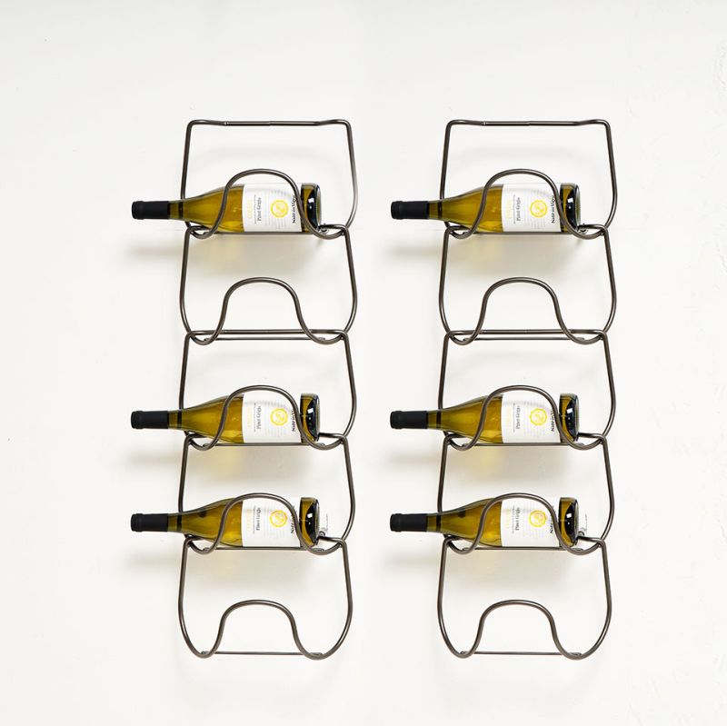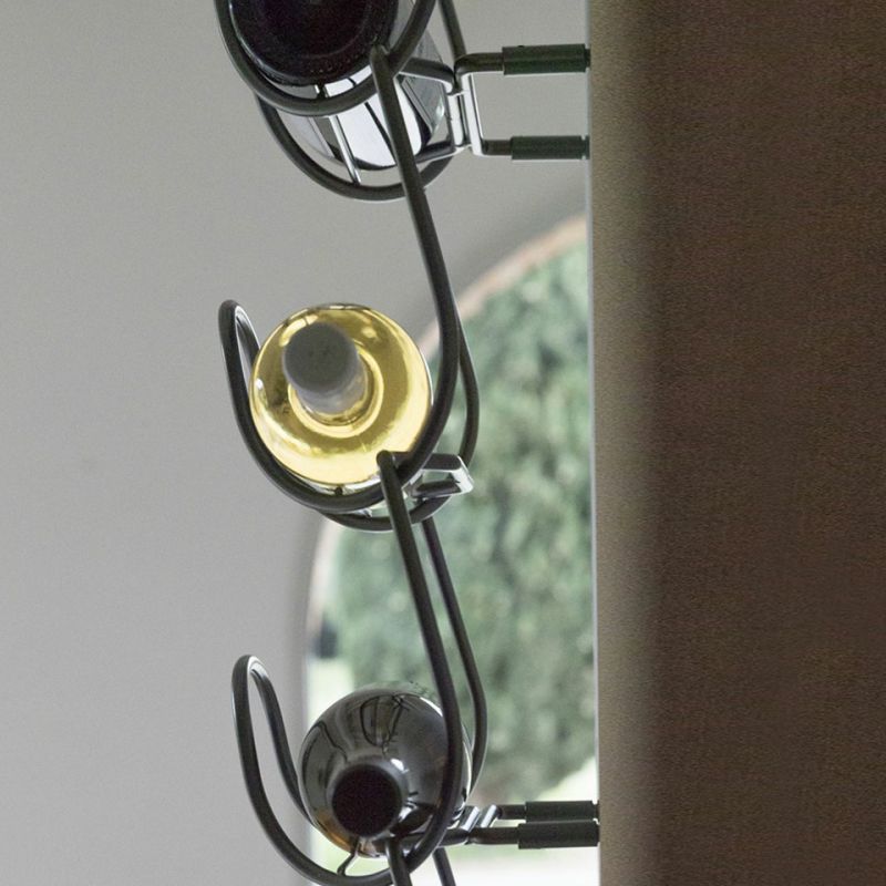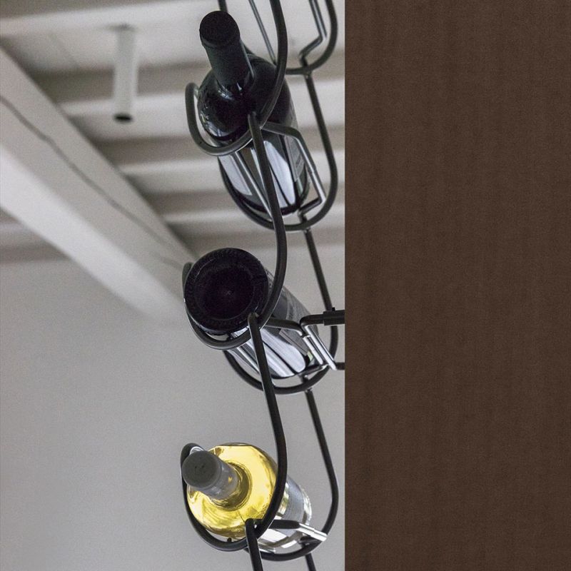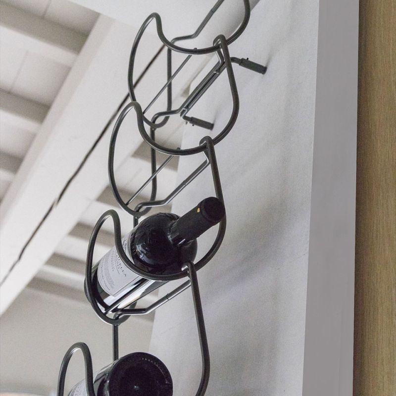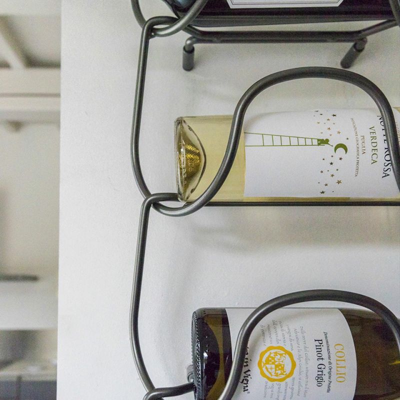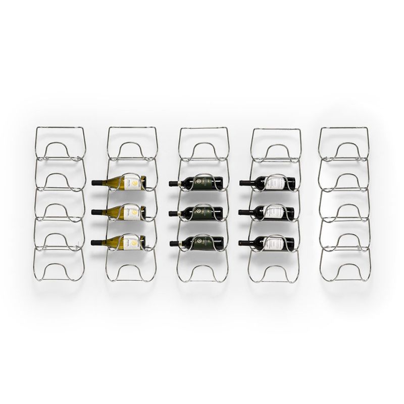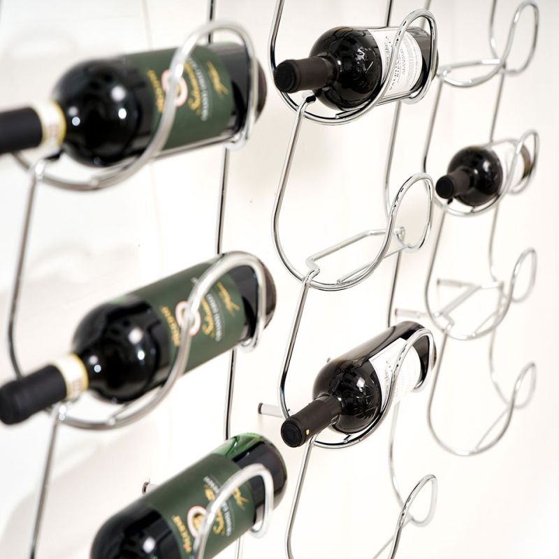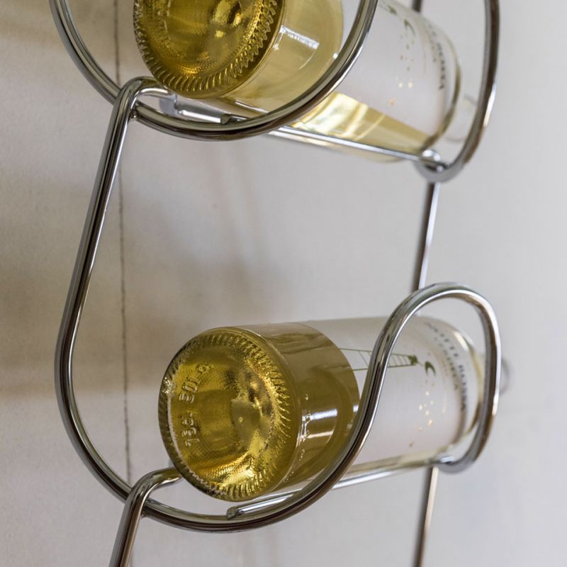 Метална поставка за бутилки, изработена от един елемент и неговото повторение. Иновативно и универсално решение, способно да побере бутилки с различни форми и размери, от най-често срещаните до по-нестандартните. Предлага се в следните варианти на покритие: полирано и хромирано.